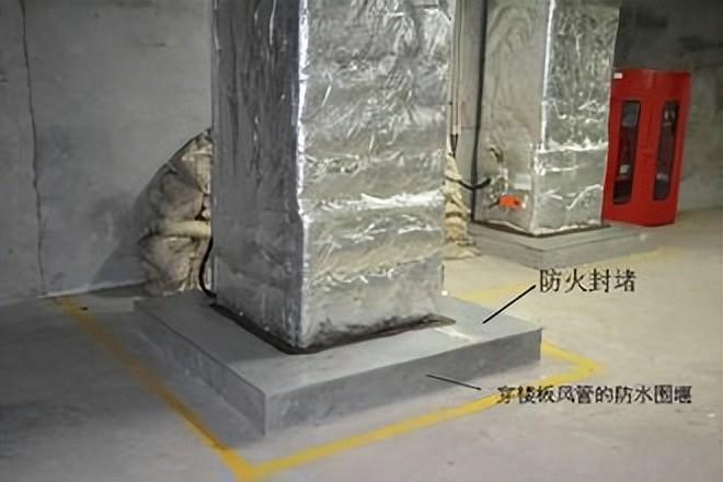 在风管穿过楼板时,应设预埋管或督察套管,其钢板厚度不应小于 1.6mm。风管和套管之间须用不燃且对东说念主体无害的柔性材料封堵,用防火堵料或内圈用玻璃棉、外圈用防火堵料封堵。保温风管穿楼板时应作念全部 200mm 高的永远性挡水坎,并作念防水贬责。