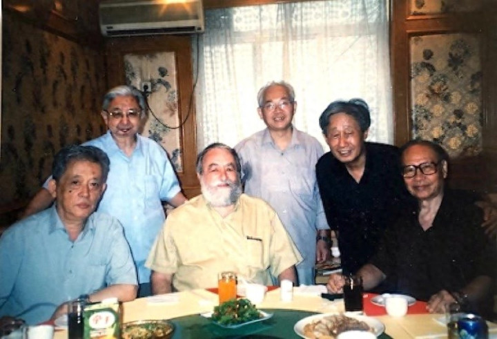 图1. 王复羊安排的午餐会。左起:王复羊、缪印堂、约翰·A·兰特、黄远林、何韦、方成。北京,2004年8月。(许颖摄,作家供图)