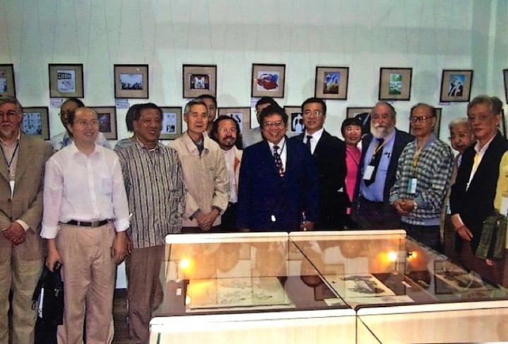 图2. 约翰·A·兰特创立的动画与漫画艺术亚洲量度中心在中国传媒大学确立揭牌典礼。右起:王复羊、缪印堂、方成、约翰·A·兰特、许颖、Lat(穆罕默德·诺·卡利德)等。北京,2006年。(作家供图)