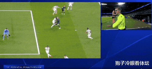 裁判蒂尔潘绝不夷犹,第一时刻判罚点球,VAR介入,犯规所在在禁区外,蒂尔潘改判纵情球。
