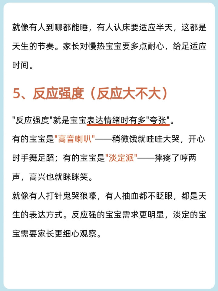 响应强度犹如“小火山” vs “小溪流”,不雅察宝宝对刺激的响应:比如换尿布时是轻轻扭动,照旧大哭大闹;听到杂音时是蹙眉,照旧吓得一哆嗦。响应是非型像“小火山”,样子抒发径直,将来可能性相配向、关爱,但也可能容易雕悍、短少耐烦。响应和睦型像“小溪流”,样子波动小,将来可能更千里稳、内敛,但也可能显得被迫、不够主动。家长对响应是非的宝宝,幸免过度刺激(如一忽儿高声语言),用暄和的神情携带;对响应和睦的宝宝,多饱读动尝试新事物,激勉主动性。