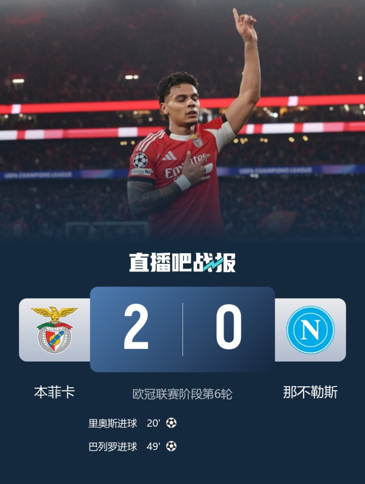 直播吧12月11日讯北京工夫4:00,欧冠联赛阶段第6轮本菲卡vs那不勒斯,比赛在光明球场打响!上半场,伊万诺维奇失单刀;瓦尼亚送大礼,奥瑟斯失良机;里奥斯门前垫射匡助本菲卡得回卓绝。下半场,里奥斯助攻,巴列罗精彩脚后跟扩大卓绝上风!最终,本菲卡2-0打败那不勒斯,穆里尼奥在与孔蒂的径直对话中取胜!
